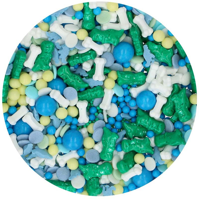 Denna härliga mix innehåller små dinosaurier, benformade strössel och skimrande pärlor i blå, gröna och gula nyanser. Strössla över tårtor, cupcakes eller kakor för en dekoration som både syns och imponerar. Perfekt när du vill skapa en rolig och lekfull känsla på t.ex. kalas med dinotema!