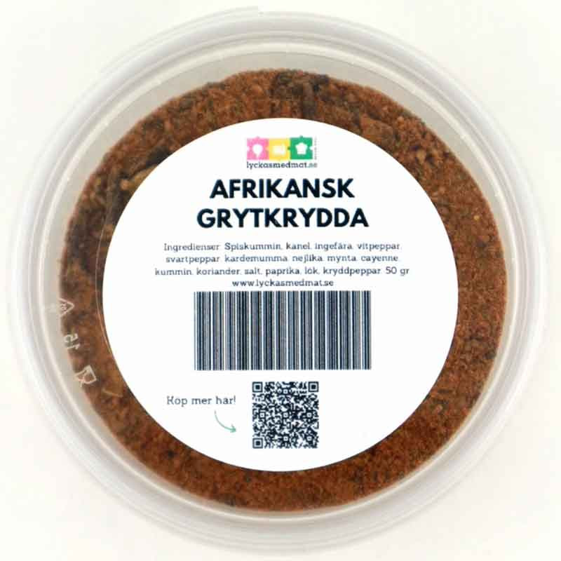 Afrikansk grytkrydda är en kryddmix innehållandes bl.a. spiskummin, kanel, ingefära, mynta och cayenne. En kryddstark och smakrik kryddmix som är väldigt god att använda i grytor! Innehåll: 50 g.