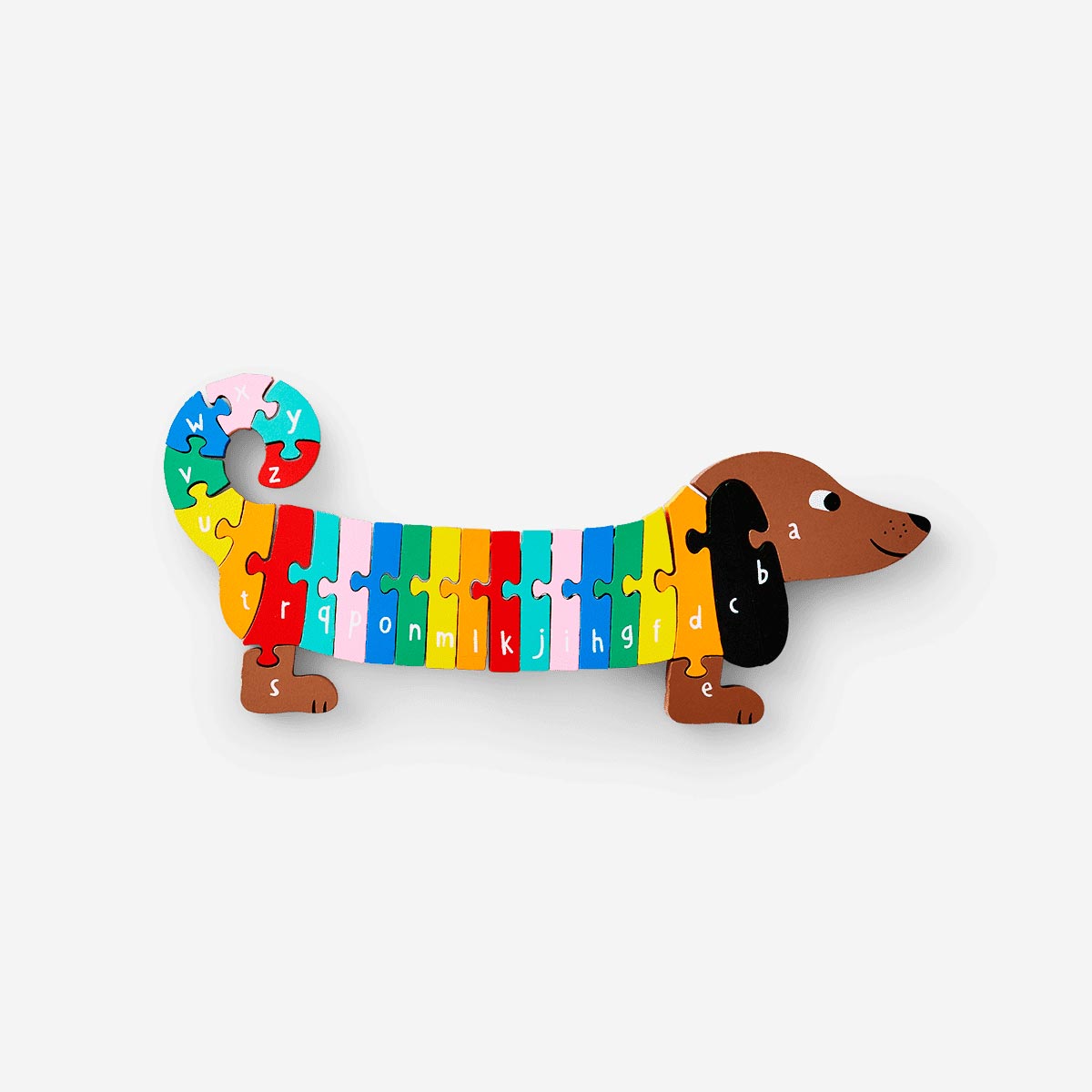 Introducera ditt barn till alfabetet på ett roligt och engagerande sätt med detta bedårande hundalfabetspussel. Pusslet är utformat med livfulla, flerfärgade bitar och hjälper barn att lära sig ABC när de pusslar ihop den charmiga hundformen. Varje bit är märkt med en bokstav från A till Z, vilket gör det till ett utmärkt verktyg för att öva på bokstavsigenkänning och alfabetisk ordning. Hundpusslet mäter 28,8 x 1,5 x 12 cm, vilket gör det till en perfekt storlek för små händer att greppa och sätta ihop. De klara färgerna och den lekfulla designen fångar barnens uppmärksamhet och uppmuntrar dem att lägga pusslet och njuta av inlärningsprocessen. Konstruktionen säkerställer att bitarna passar ihop ordentligt, vilket ger en tillfredsställande pusselupplevelse. Detta pussel är byggt för att klara timmar av lek och lärande. Det är ett utmärkt pedagogiskt verktyg för att utveckla finmotorik, hand-öga-koordination och kognitiva förmågor. Alfabetspusslet med hund är perfekt för både hem och klassrum och gör det till en rolig aktivitet att lära sig alfabetet. Förbättra ditt barns pedagogiska resa med detta härliga och färgglada hundalfabetspussel och se dem njuta av det roliga i att lära sig sina ABC.