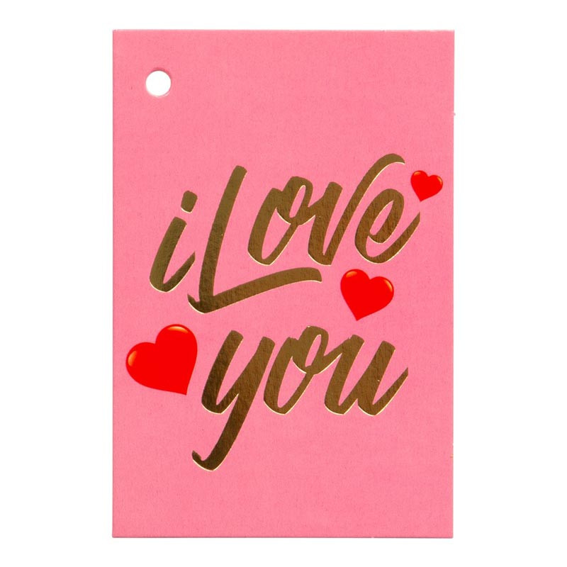 Denna lilla alla hjärtans dag kort i rosa med texten ”I love you” är det perfekta sättet att uttrycka kärlek till någon speciell. Kortet är 6,5 x 9,5 cm och har en blank insida där du kan skriva ditt personliga meddelande. Med ett litet hål kan du enkelt hänga kortet i ett snöre runt en blombukett eller ett paket. Inkluderat är även ett matchande kuvert.