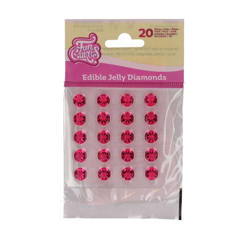 Med ätbara gelé-diamanter från FunCakes kan du ta dina bakverk till en helt ny nivå. Använd dem som dekoration på tårtor, cupcakes, macarons eller kakor! Perfekta för bröllopstårtor, men också strålande på jul- och vintertårtor eller födelsedagstårtor. Placera dem på en frostingtoppad cupcake, låt dem glittra mellan spritsade rosor på en tårta eller använd dem som eleganta detaljer på en dessertbuffé. Eftersom de är helt ätbara kan gästerna njuta av både utseendet och smaken – en liten dekoration som gör stor skillnad. Storlek per diamant: ca 10 mm. Antal: 20 stycken. Färg: Rosa. Förvaras på en sval, torr plats. Exponera inte för solsken under en längre tid. Tips! Om du fryser diamanterna innan användning kan du enkelt ta ut dem från förpackningen.