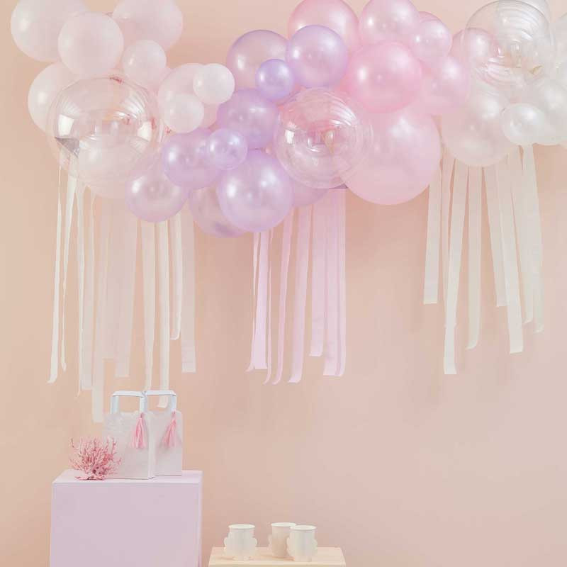 Skapa en fantastisk atmosfär på ditt kalas med denna vackra ballongbåge i pastellrosa, ljuslila och naturvit. Perfekt för teman som unicorn eller mermaid.