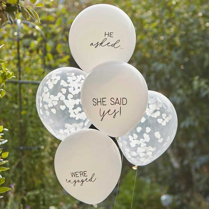 Dekorera din förlovningsfest med dessa vackra ballonger i en förpackning med 5 stycken. Ballongerna är tillverkade av ekologiskt nedbrytbart material, inklusive konfettin. Fyll dem med luft för en festlig atmosfär!