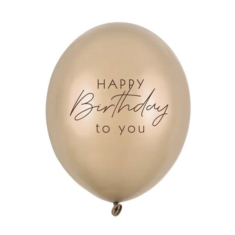 Skapa en elegant atmosfär på födelsedagsfesten med dessa metallicfärgade ballonger i nyansen cold gold. Med trycket “Happy Birthday to you” blir de till en exklusiv detalj som passar perfekt i alla festdekorationer.