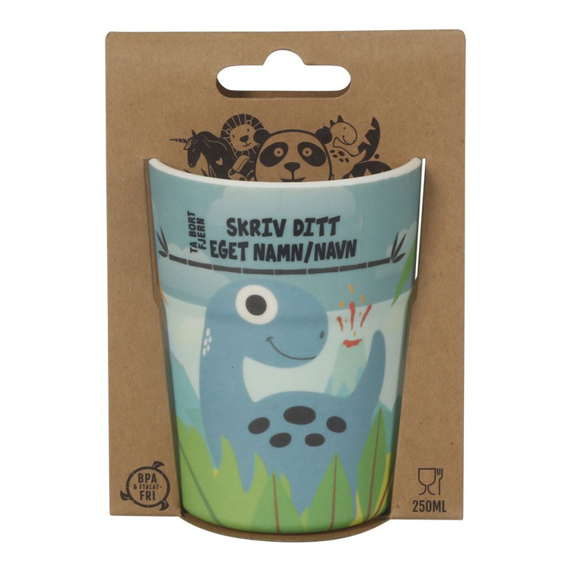 Denna söta bambumugg med dinosauriemotiv är perfekt för barn som älskar dinosaurier. Muggen kan personifieras med ett valfritt namn och är tillverkad av BPA-fria material som bambufibrer, majsstärkelse och resin. Den rymmer 250 ml och tål maskindisk, men bör inte användas i mikrovågsugnen. Muggen är idealisk för att servera kalla drycker till små dinosaurieentusiaster.