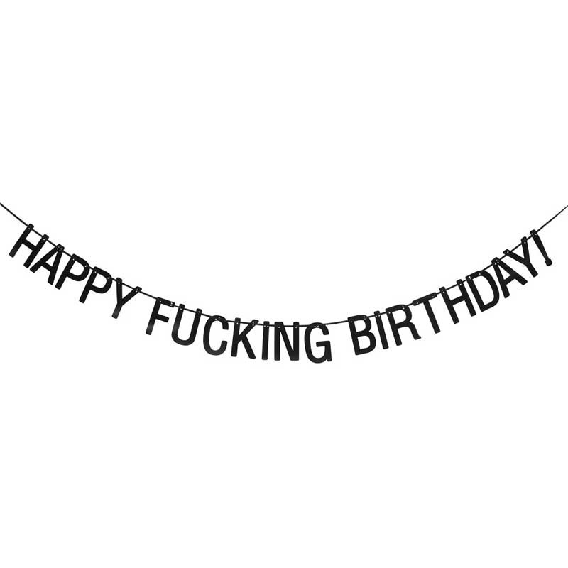 Skapa en rolig atmosfär på födelsedagsfesten med denna snygga svarta girlang som har texten ”Happy fucking birthday”. Med en total längd på 3,6 meter och bokstäver som är ca 19 cm stora är den perfekt att hänga upp som dekoration.