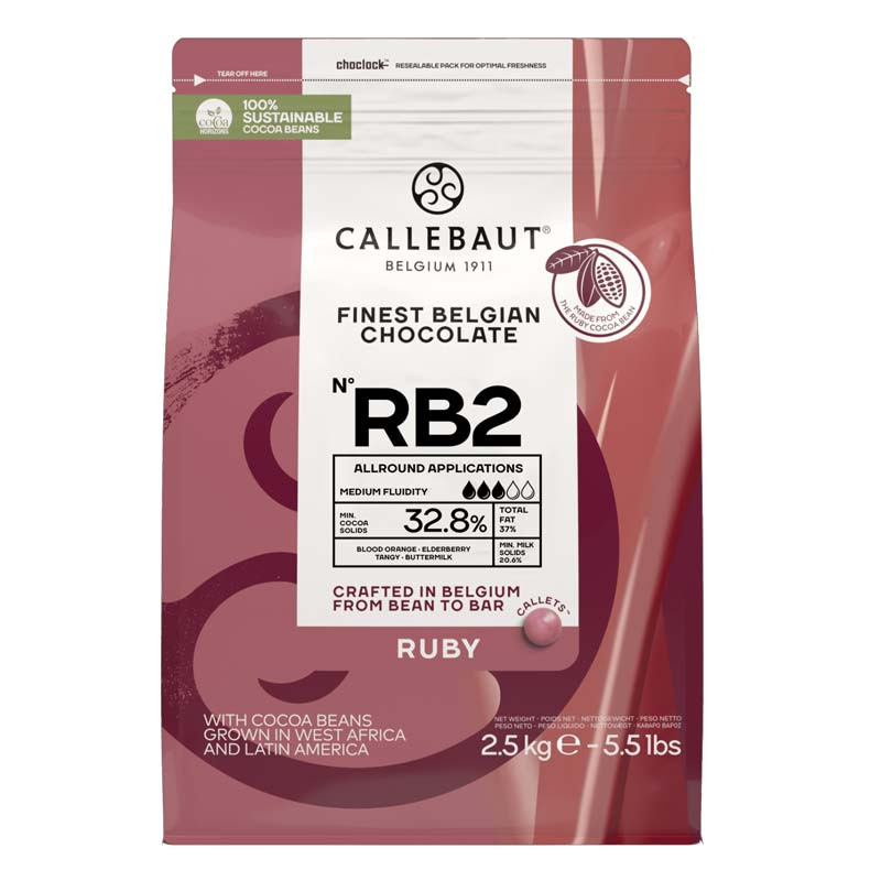 Belgisk rosa choklad Callebaut Callets Ruby är en unik och vacker choklad med intensiv fruktig smak av bär. Den rosa färgen kommer från naturliga kakaobönor och chokladen innehåller minst 47,3% kakao och 26,3% mjölk. Med en total fettmängd på 36% är denna Callebaut choklad en fantastisk ingrediens för chokladkreationer och dekorationer.