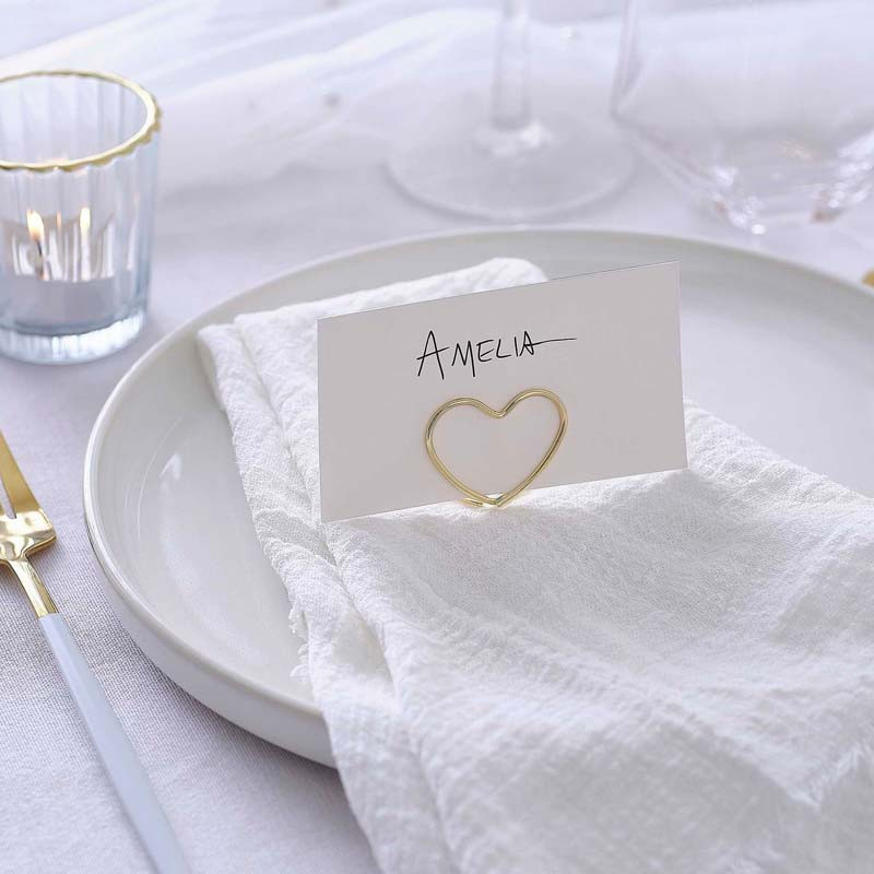 De vackra hjärtformade korthållarna i guld från Ginger Ray är perfekta för att skapa en romantisk och elegant dukning vid bröllop, jubileum eller andra speciella tillfällen. Med dessa bordsplaceringshållare och tillhörande placeringskort kan du enkelt markera gästernas platser eller information om rätter och allergier.