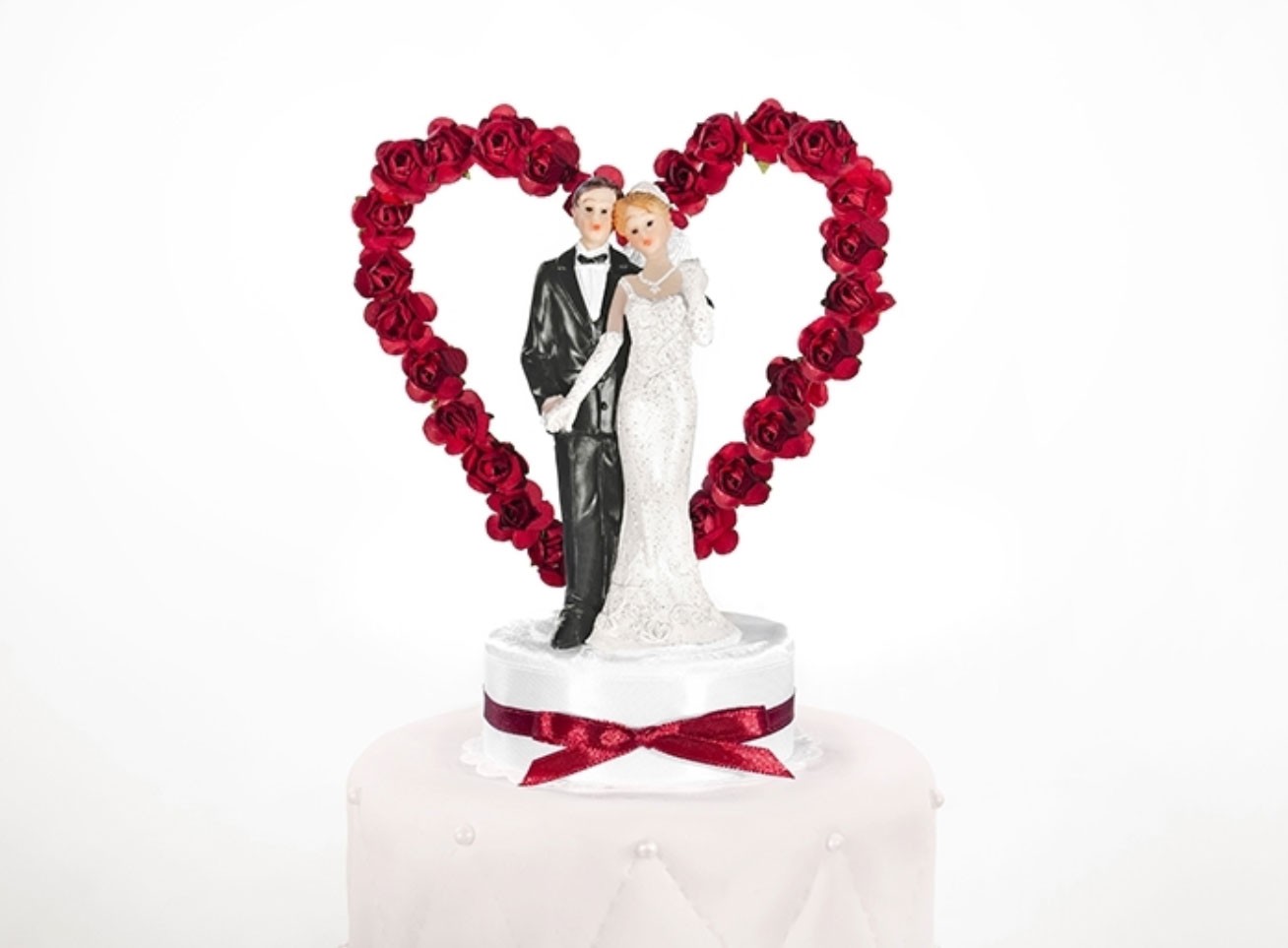 Det vackra brudparet i form av ett hjärta med rosetter är den perfekta dekorationen för din bröllopstårta. Tillverkat av polyresin och med en höjd på 16 cm, passar detta brudpar från PartyDeco bra på de flesta typer av bröllopstårtor.