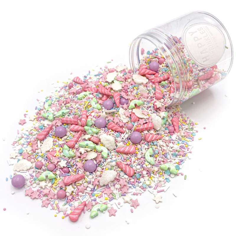 But first, unicorns är en fin strösselmix från Happy Sprinkles som ger en extra touch av magi till dina bakverk. Mixen är fylld med enhörningshorn, regnbågar, moln, kulor och stjärnor, perfekt för att göra dina tårtor, cupcakes eller glassar ännu festligare. Passar utmärkt till enhörningskalaset eller bara för att sprida lite glädje i vardagen. Med sina glada färger som rosa, grön, lila, vit m.m. kommer detta strössel verkligen att lysa upp varje tillfälle!