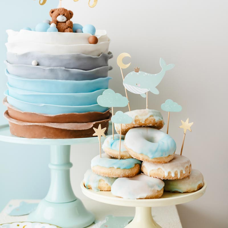 • Innehåller 7 st cake toppers i form av valar, stjärnor, måne och moln
