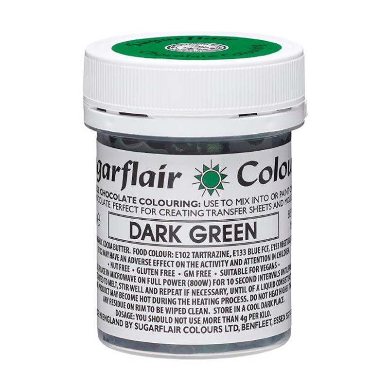 Med Sugarflair chokladfärg kan du enkelt färga din choklad i den färg du vill ha. Idealisk för att skapa dina egna överföringsark eller lägga till färger i ditt chokladarbete. Den mörkgröna chokladfärgen ger din praliner och chokladskapelser en djup och elegant nyans.