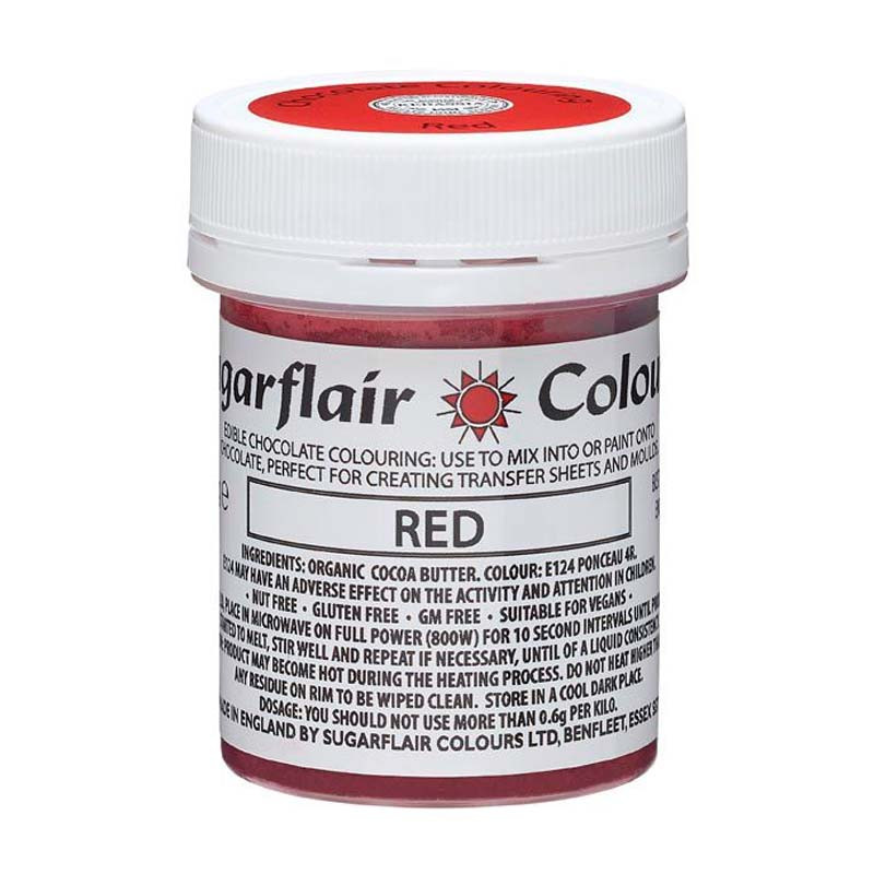 Med Sugarflair chokladfärg kan du enkelt färga din choklad i den färg du vill ha. Idealisk för att skapa dina egna överföringsark eller lägga till färger i ditt chokladarbete. Chokladfärgerna är tillverkade av färgat kakaosmör och är specifikt utformade för att ge din choklad en livlig färg. De är mångsidiga och enkla att använda. Värm försiktigt i en mikrovågsugn för att smälta, måla sedan i en pralinform eller på chokladplast/tårtplast för att skapa vackra mönster.