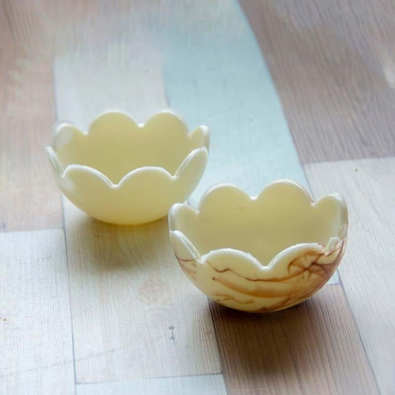 Chokladformen i form av en liten skål består av tre delar som underlättar choklad- och pralintillverkning. Med transparent plast och silikonmaterial är denna form perfekt för att skapa enhetliga och vackra chokladskal varje gång.