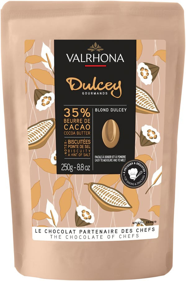 Valrhonas Dulcey är en karamelliserad vit choklad med en vacker färg av smörkola och smaker av kola, smörkex och dulce de leche. Chokladen innehåller minst 35% kakaofett och passar perfekt till olika desserter som mousse, glass, pannacotta och cookies. Den subtila smaken av söta kolakakor kan förstärkas genom att kombinera chokladen med essenser av banan, hasselnöt, kaffe eller kola.