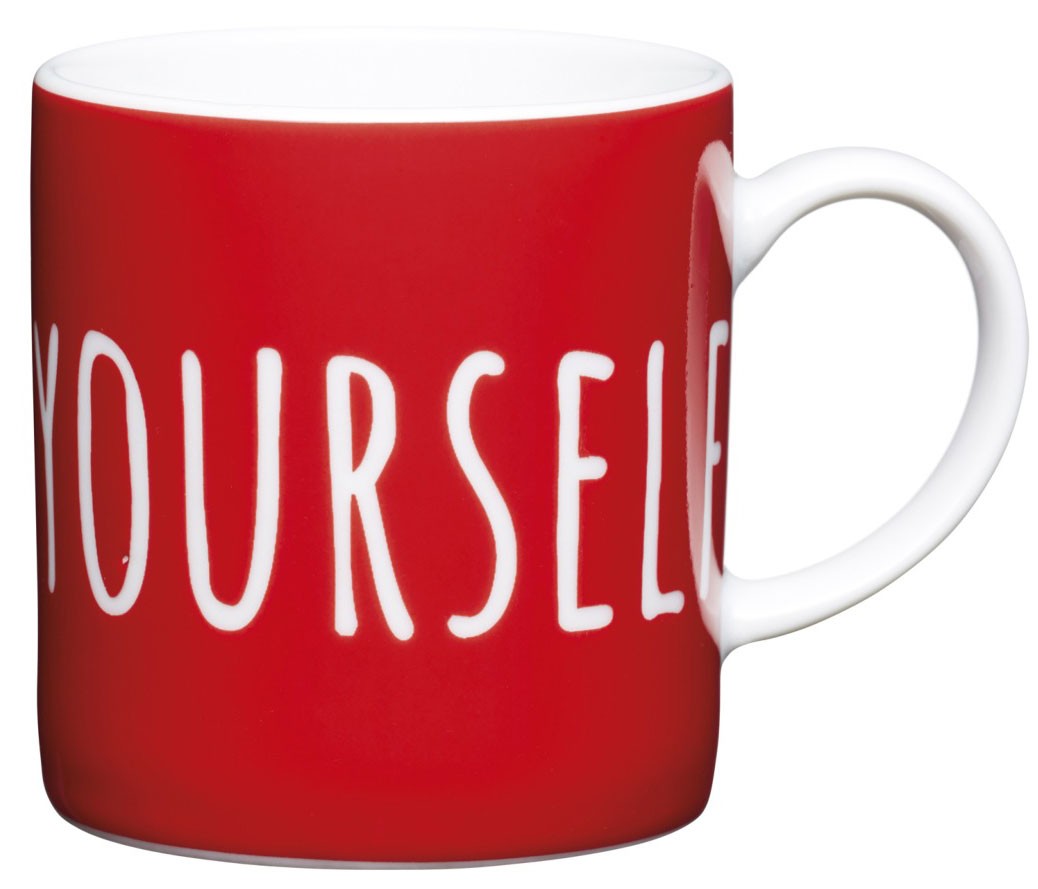 Denna fina espressokopp från Kitchen Craft är perfekt för att njuta av en god espresso eller piccolo latte. Koppen är tillverkad i porslin och är röd med den inspirerande texten ”Espresso yourself” tryckt i vitt. Med en volym på 80 ml är den perfekt för en enkel och smakfull kopp kaffe. Koppen tål både maskindisk och mikrovågsugn, och dess kompakta mått gör den lätt att placera på vilket kaffebord som helst.