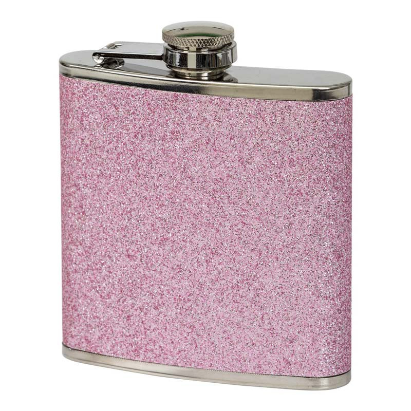 Den glittriga fickpluntan i rosa är ett perfekt tillbehör för studenten, nyår och fest. Den har en storlek på 9,5 x 9,5 cm (11 cm med korken inräknad) och är tillverkad av rostfritt stål.