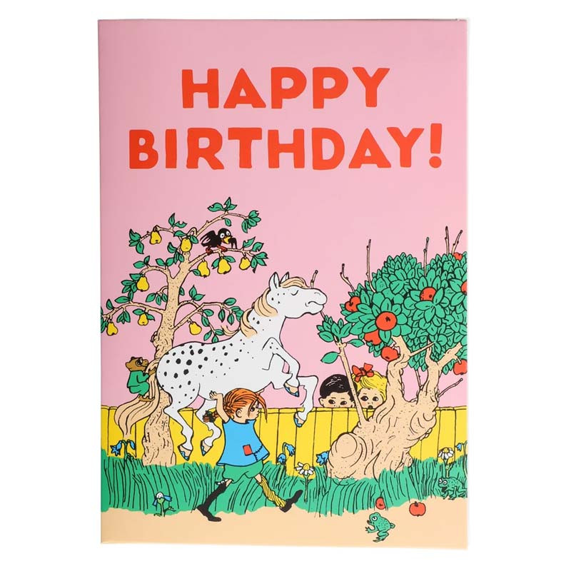 Fira födelsedagen med Pippi och vännerna! Det här färgglada grattiskortet med motiv från Astrid Lindgrens sagovärld är fullt av lek och glädje – precis som ett barnkalas ska vara. Pippi, Lilla Gubben och Tommy & Annika önskar ett riktigt stort ”happy birthday”! Kortet levereras med vitt kuvert och är redo att fyllas med en personlig hälsning. Fler produkter för ett lyckat Pippi-kalas finns här! Storlek: 12 x 17 cm Vikt kort Inklusive kuvert
