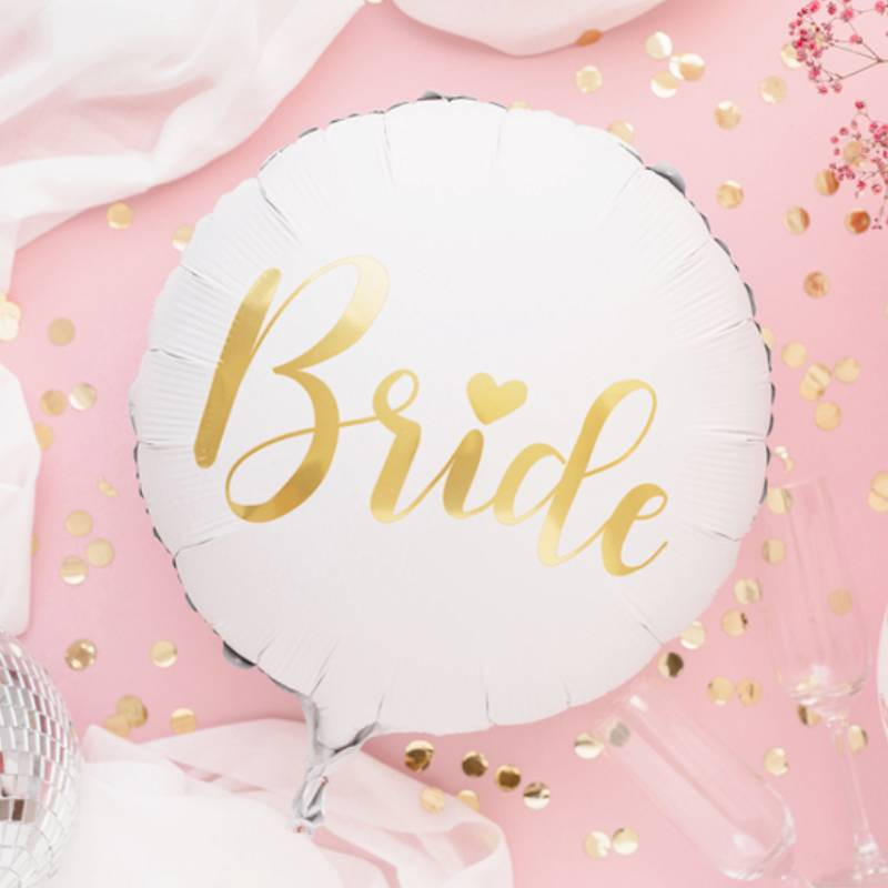 Dekorera möhippan eller bröllopet med denna eleganta folieballong i vit och guld med texten ”Bride” skriven på. Ballongen är ca. 35 cm stor och kan fyllas med både helium eller luft.