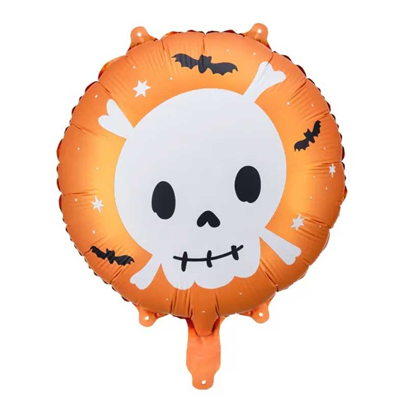 Den runda folieballongen i orange med en döskalle och fladdermöss är en perfekt dekoration för halloween-fester. Ballongen kan blåsas upp med antingen luft eller helium och kommer med ett sugrör för enkel uppsättning.