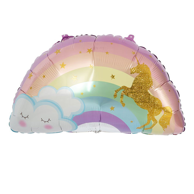 Dekorera ditt kalas med denna vackra folieballong i form av en regnbåge i pastellfärger med moln, enhörningar och stjärnor. Fyll den med luft eller helium för en perfekt festlig touch!