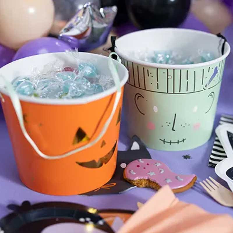 Dessa söta hinkar i 2-pack med olika halloween motiv är perfekta för bus eller godis. Hinkarna föreställer en pumpa och ett monster och passar även bra som snacksskålar på halloweenfesten. Fyll dem med godis, popcorn eller andra snacks som gelémaskar och godissnören för en skrämmande festlig upplevelse!