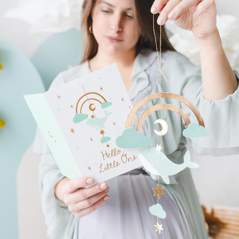 Det gröna kortet ”Hello little one!” är perfekt för dop eller baby shower. Det är dubbelvikt och har en hängande dekoration för extra charm. Insidan av kortet är också grönt, vilket skapar en enhetlig look. Ett grönt kuvert med guldkanter medföljer för att komplettera presentationen.