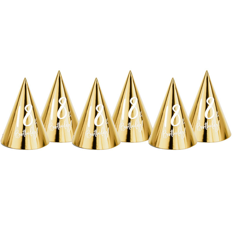 Dessa fina guldiga partyhattar från PartyDeco är perfekta för den som fyller 18 år! Tillverkade i stabilt papper med en praktisk snöre för att hålla dem på plats, är dessa partyhattar en rolig detalj för vilket festfirande som helst.