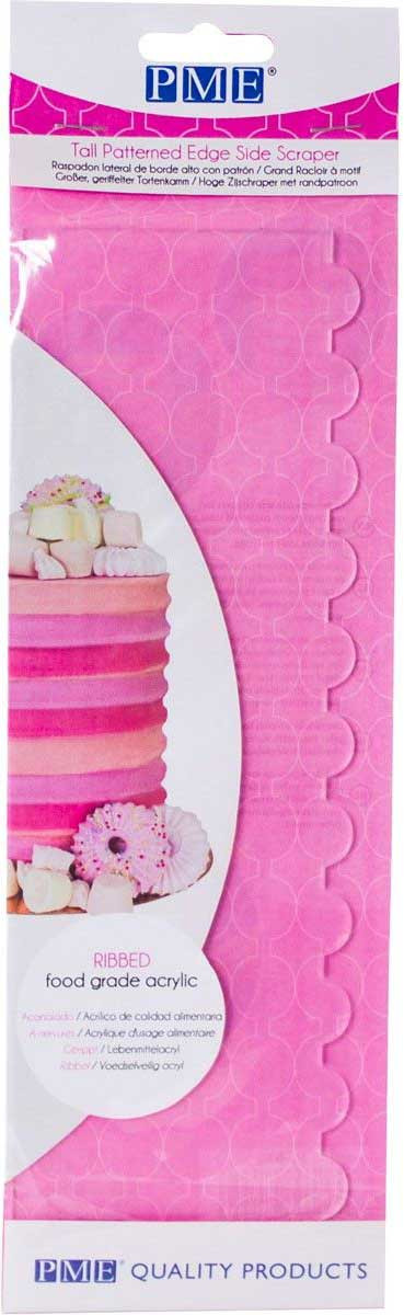 Denna höga tårtskrapa med mönster, Ribbed, från PME är ett utmärkt verktyg för att skapa vackra smörkrämsformer på tårtor och bakverk. Den räfflade designen ger ett unikt utseende, medan den släta sidan ger möjlighet att skapa en enhetlig yta. Skrapan är tillverkad av akrylplast och passar perfekt för smörkräm, royal icing, ganache och mycket mer.