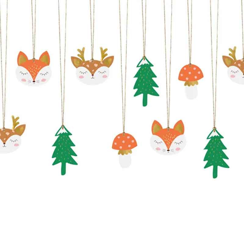 Dekorera dina julklappar med dessa vackra juletiketter från PartyDeco. I paketet ingår 12 stycken etiketter med motiv av räv, rådjur, svamp och julgran. Dessa pappersetiketter kan också användas som dekoration i granen och levereras med guldtråd för enkel upphängning.