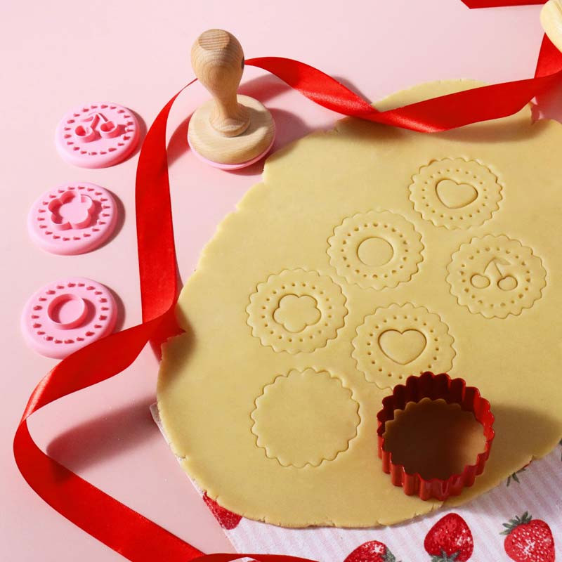 Detta kakstämpelset från PME är perfekt för att skapa vackert präglade kakor, idealiskt för Linzer-kakor och andra småkakor. Setet innehåller fyra silikonstämplar med romantiska motiv, en rund vågig utstickare och ett trähandtag. Använd stämplarna för att trycka mönster i degen eller fondanten och sedan stansa ut kakorna med utstickaren. Perfekt för att fylla med sylt och skapa klassiska hjärtformade småkakor till alla hjärtans dag eller andra speciella tillfällen. Pudra stämplarna lätt med mjöl för att förhindra att degen eller fondanten fastnar.