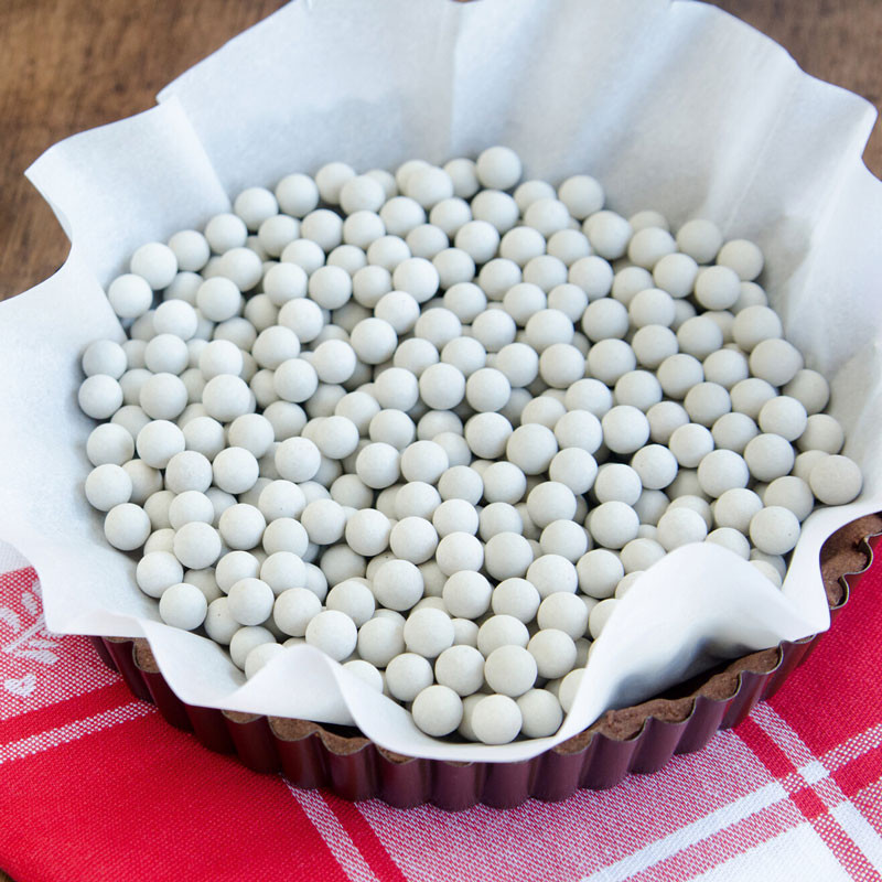 Använd bakningskulorna såhär: Täck bakformen med deg, nagga denna. Lägg ett bakplåtspapper över degen och placera kulorna ovanpå pappret innan gräddning. Efter gräddning, när kulorna har svalnat, skölj kulorna i vatten och skrubba lite med en diskborste. Lägg dem sedan på en handduk för att torka.