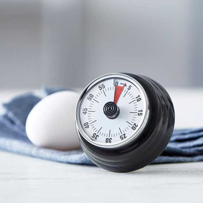 Denna svarta kökstimer från Funktion är tillverkad i metall och kan enkelt ställas in genom att vrida på ratten upp till 60 minuter och sedan ställa in önskat antal minuter. Timern har en magnet på baksidan så att den enkelt kan fästas på kylskåpet, ugnen, fläkten eller någon annan metallyta.