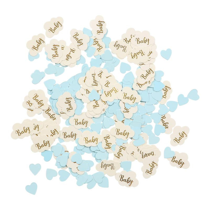 Denna blå konfetti Baby Boy är ett enkelt och effektfullt sätt att dekorera bordet till babyshower, dop, födelsedag eller kalas. De små konfettibitarna i blå toner skapar en festlig känsla och kan användas både som bordsdekoration och i presentpåsar eller kort. Konfettin passar även perfekt till gender reveals – låt gästerna överraskas med ett regn av blått när ni avslöjar att det blir en liten pojke. Kombinera gärna med våra andra dekorationer för babyshower för att skapa en enhetlig och minnesvärd dukning. Vikt: 20 g Färger: Ljusblå, vit och guld Form: Hjärtan och moln Storlek hjärta: 1,5 cm Storlek moln: 3 cm Material: FSC-märkt papper