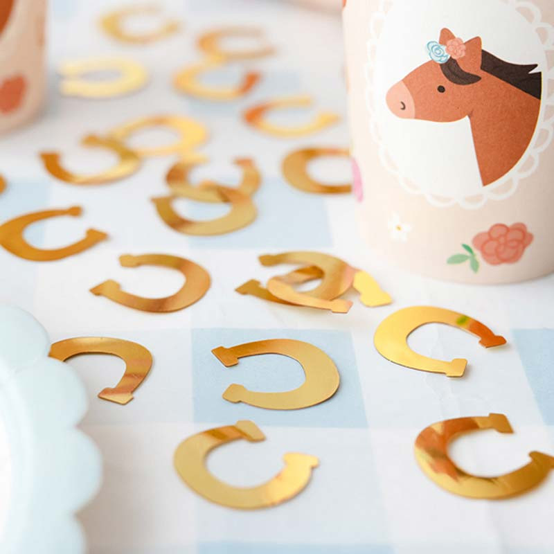 Dekorera bordet med detta hästskoformade konfetti i guld från PartyDeco för att sätta stämningen på barnkalaset med hästtema!