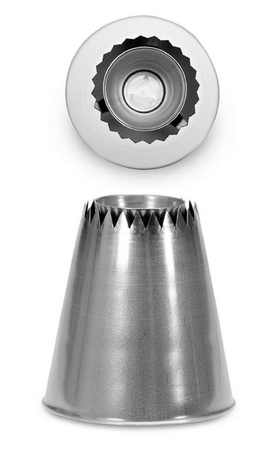 En stor kranstyll i rostfritt stål från Städter, perfekt för att spritsa småkakor som syltkakor. Den kan även användas för tårtdekorering eller för att skapa vackra marängkransar. Diameter på öppningen är 3 cm och höjden är cirka 6 cm.