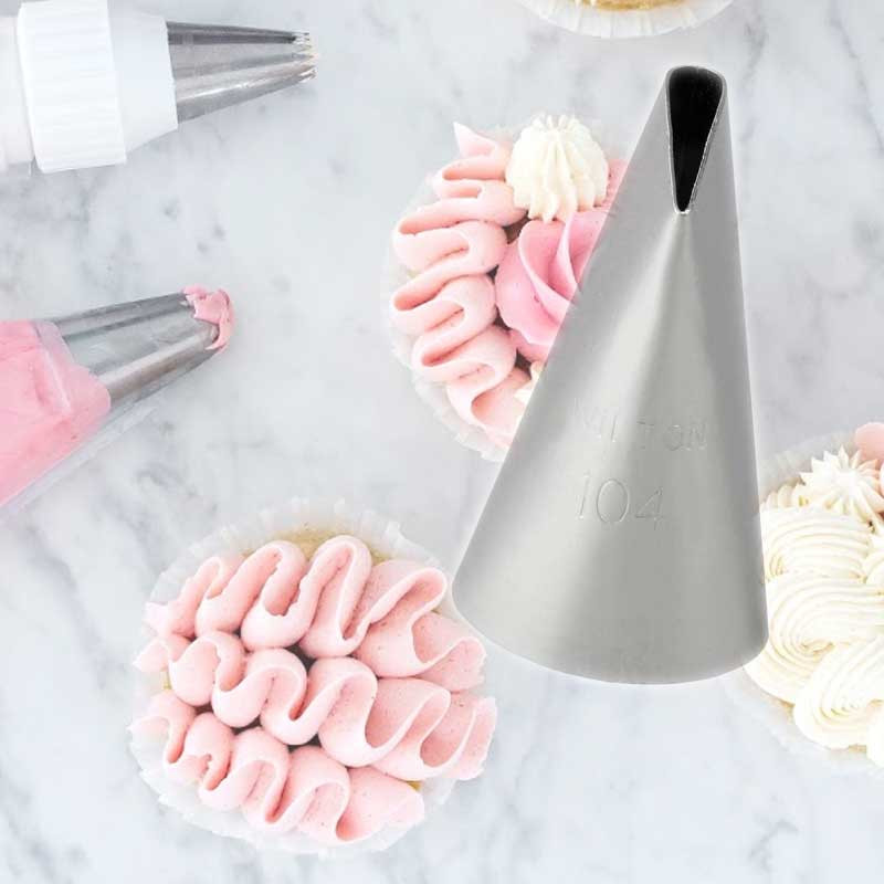 Den Kronbladstyll nr 104 från Wilton är perfekt för att spritsa rosor och andra blommor i smörkräm, grädde eller frosting för att dekorera tårtor och cupcakes. Den är tillverkad i metall och rekommenderas att diskas för hand. Passar perfekt ihop med Wiltons tyllkoppling för små tyllar med en öppning på ca. 1,4 cm.