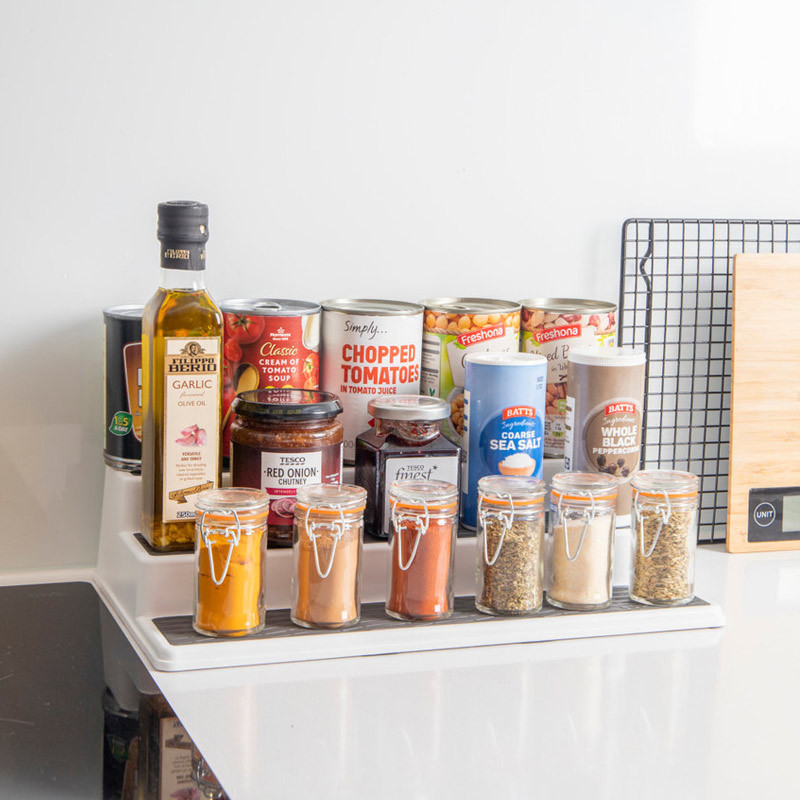 Denna kryddhylla med tre våningar är en praktisk och stilren lösning för att organisera dina kryddor med en anti-slip-matta för att hålla dem på plats.