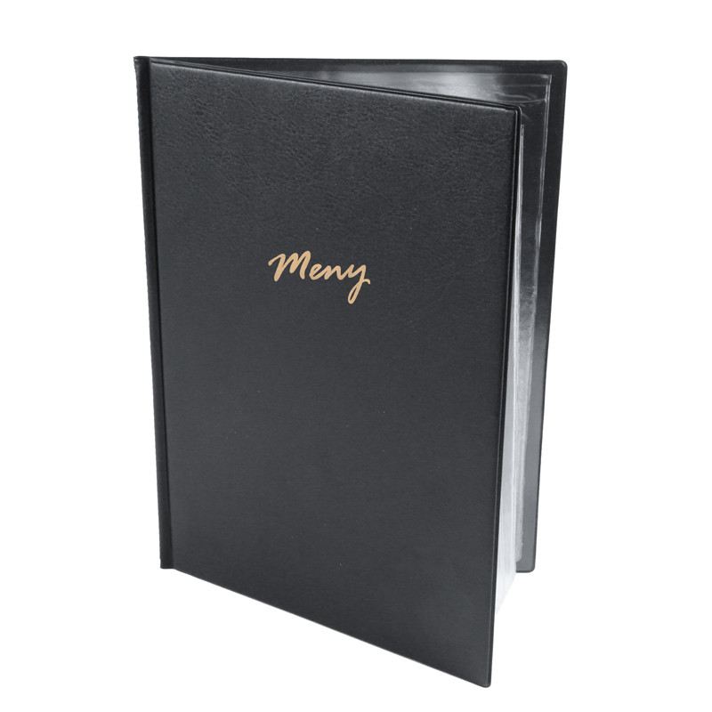 Denna fina menypärm i vinyl har 6 blad vilket ger totalt 12 sidor. Pärmen är i A4-format och kommer i en elegant svart färg med texten ”Meny” i guld.