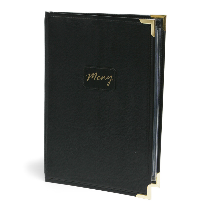 Denna eleganta menypärm i konstläder med mässingshörn är perfekt för att organisera dina A4-menyer på ett stilrent sätt. Den svarta pärm med texten ’Meny’ i guld ger ett exklusivt intryck.