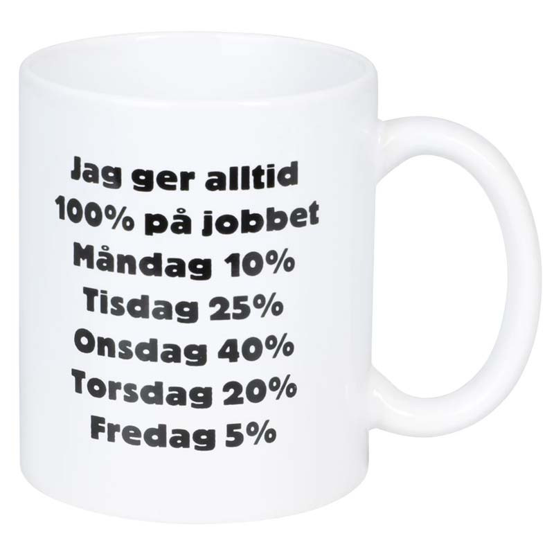 Med texten ”100% på jobbet” är denna mugg perfekt för den arbetsnarkomanen som behöver en humoristisk kaffekopp för att överleva långa arbetsdagar. Den generösa volymen på 300 ml och det bekväma handtaget gör den både praktisk och rolig. En idealisk present till kollegan som alltid kämpar på eller som ett roligt inslag i fikarummet.