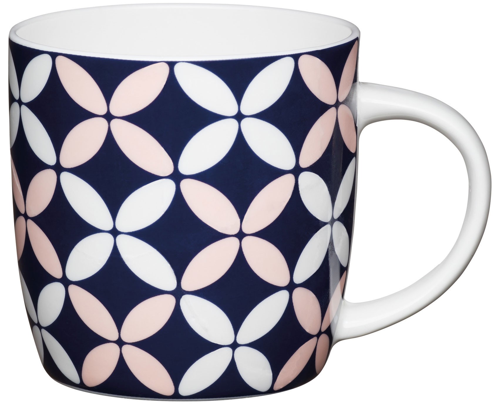 Denna stilrena mugg i porslin från Kitchen Craft har ett vackert motiv i vitt och ljusrosa på en mörkblå botten. Perfekt för att njuta av din favoritdryck som kaffe, te eller varm choklad. Med ett bekvämt öra och en storlek som passar perfekt att kupa händerna runt, är denna mugg både praktisk och snygg.