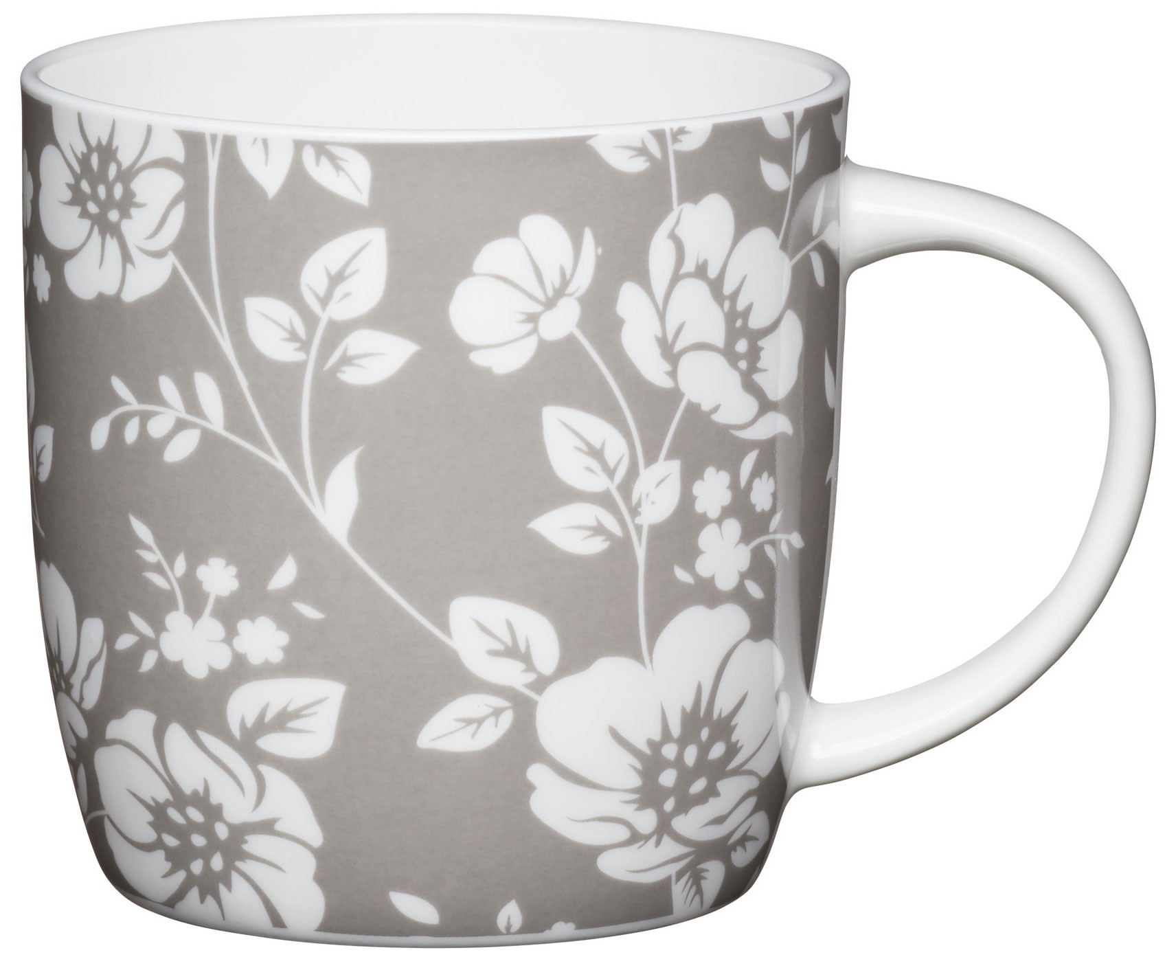 En snygg mugg i porslin från Kitchen Craft med motiv av vita blommor på en grå botten. Denna mugg är perfekt för kaffe, te, varm choklad eller vilken dryck du föredrar. Den har ett bekvämt öra och är i en optimal storlek för att kupa händerna runt. Med en volym på 425 ml är den både praktisk och stilfull. Muggen tål både maskindisk och mikrovågsugn för enkel rengöring och uppvärmning. Med en diameter på 8,5 cm och en höjd på 9 cm är den perfekt för daglig användning eller som en vacker present.