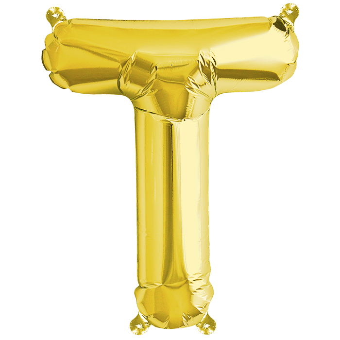 Denna bokstavsballong i form av bokstaven T är tillverkad av guldfärgad microfolie med en självslutande ventil. Den är perfekt för evenemang, födelsedagskalas och fester! Ballongen fylls med luft och har en storlek på 41 cm. Tillverkad av Northstar Balloons.
