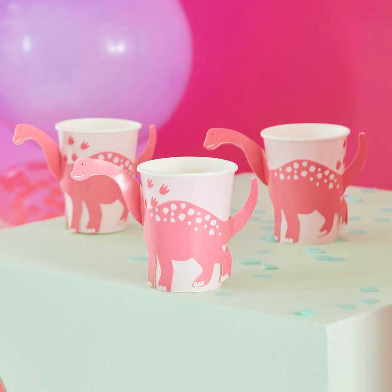 Duka med dessa effektfulla pappersmuggar med rosa dinosaurie på i 3D. Perfekt till barnkalaset. Mixa och matcha med tallrikar, servetter och dekorationer för ett lyckat dinosauriekalas! Antal: 8 st Material: Papper Färg: Rosa och vit FSC certifierad.