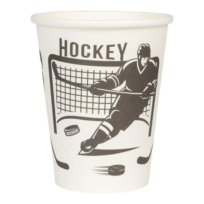 Dessa pappersmuggar med hockeymotiv är perfekta till kalaset för alla små (och stora) hockeyälskare. Med svartvitt tryck av hockeyspelare blir muggarna en snygg och sportig detalj på det dukade bordet. Matcha gärna med våra tallrikar och servetter i samma tema för en enhetlig dukning. Antal: 8 stycken Höjd: 9,5 cm Volym: 250 ml Stilren design som passar både barn och vuxna.