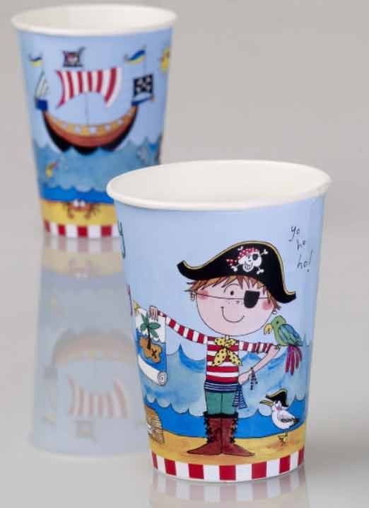 Dessa åtta pappersmuggar med söta piratmotiv är perfekta för födelsedagskalaset med pirattema. Var och en rymmer 200 ml vätska och kommer definitivt att sätta stämningen på festen!