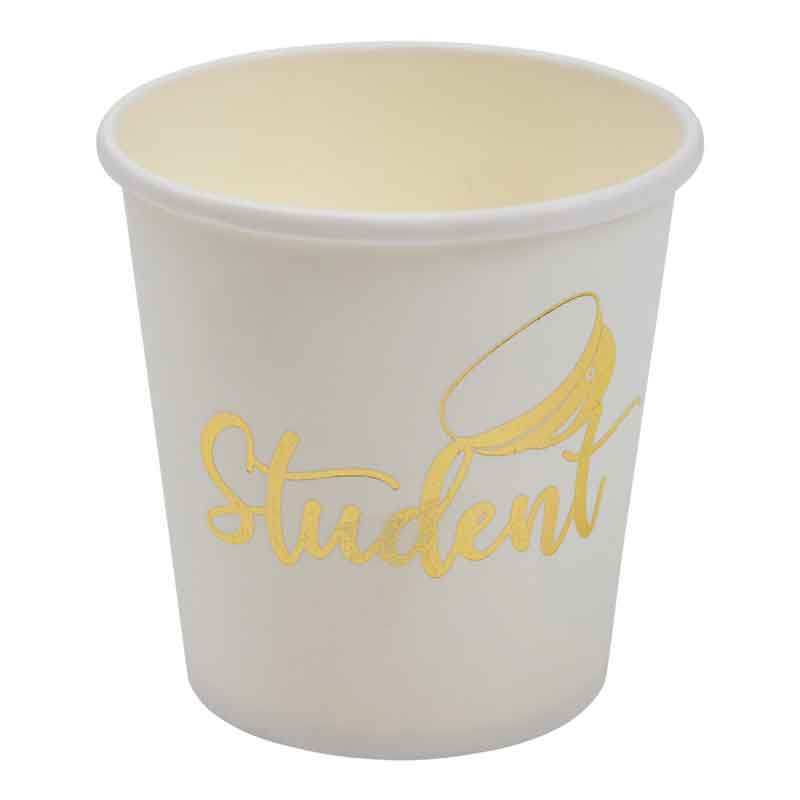 De fina pappersmuggarna med texten Student i guld kommer i en praktisk förpackning om 8 stycken. Perfekta att använda vid picknicken eller studentmottagningen för att skapa en festlig stämning!
