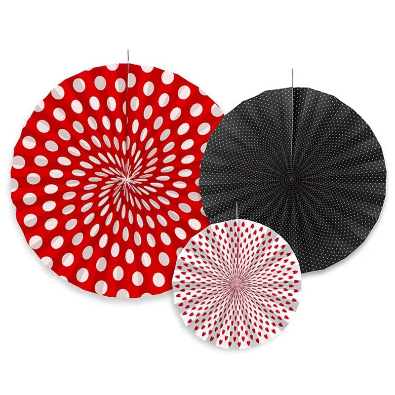 Dekorativa pappersfjädrar i röd, vit och svart med detaljer som söta prickar och hjärtan. Häng upp i taket med hjälp av det medföljande snöret, på väggen eller använd som bordsdekoration direkt på bordet. Antal: 3 stycken. Omkrets: 23, 32 och 40 cm. Färger: Röd, vit, svart.