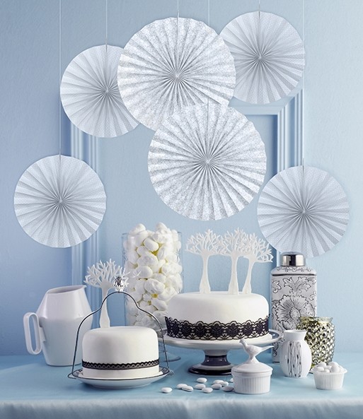 Dekorativa pappersrosetter i gråblå färg som är perfekta för fest eller kalas. Dessa rosetter kan hängas upp i taket eller på väggen med det medföljande snöret, eller så kan de användas som bordsdekoration direkt på bordet. Setet innehåller tre stycken rosetter i olika storlekar: 23 cm, 32 cm och 40 cm i diameter.